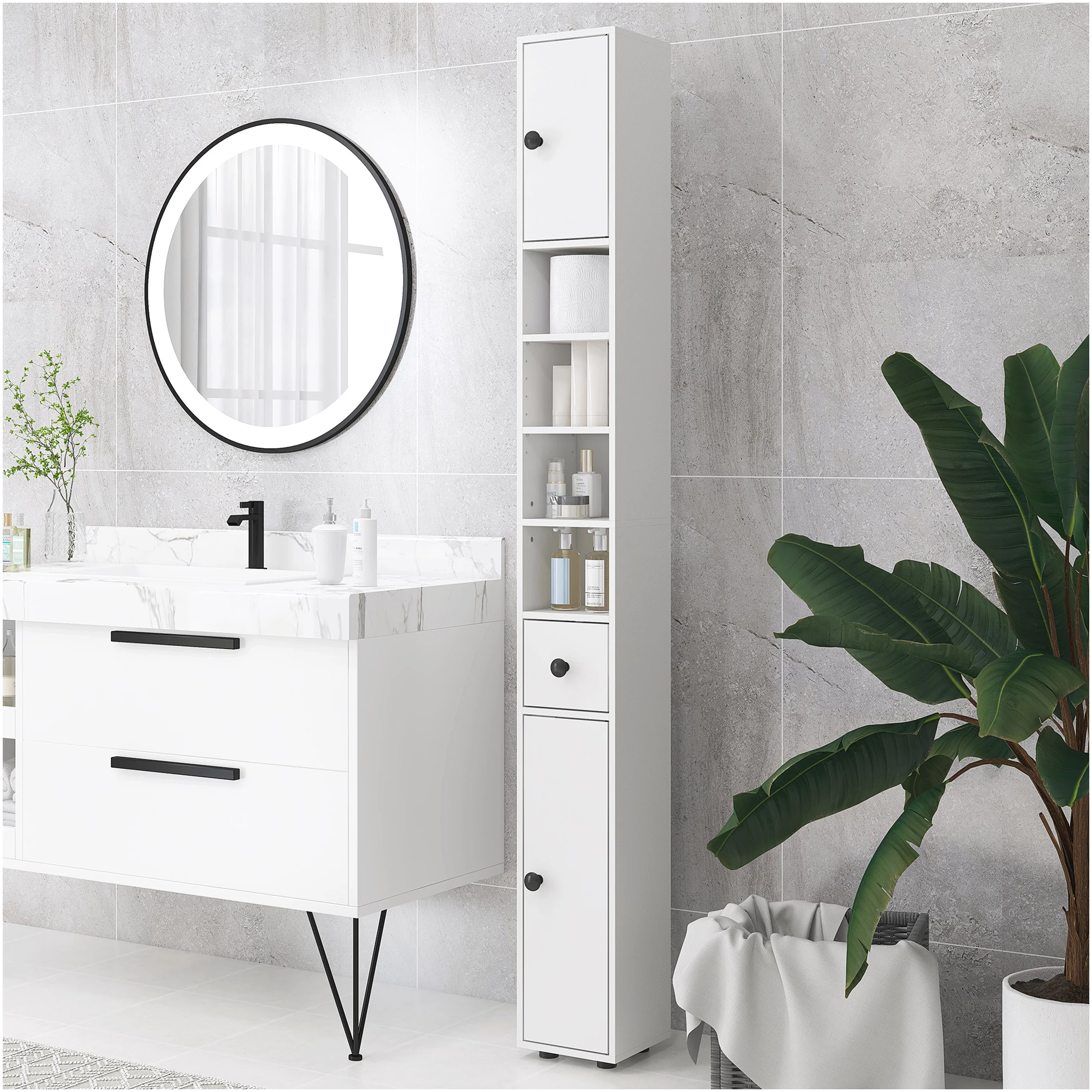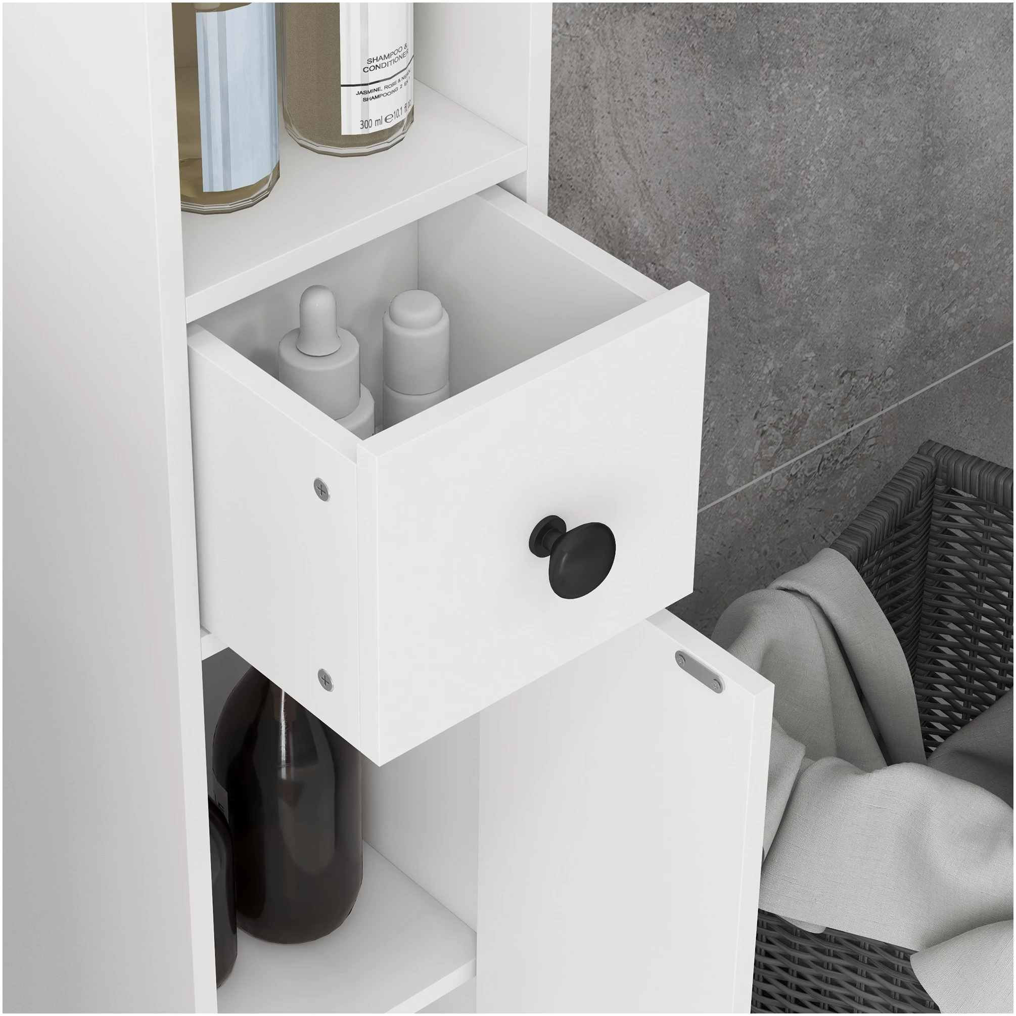 - Gir plass til baderoms- og hygieneartikler som håndklær, rengjøringsprodukter og toalettpapir