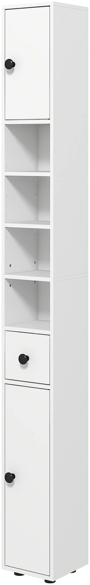 - Skapet har et øvre og et nedre skap, en skuff samt fire åpne hyller